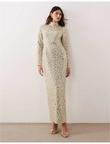 ARRANGE textural sequin high neck long sleeve maxi dress in buttermilk-White