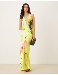 JW PEI halterneck tie detail plunge neck satin maxi dress in yellow multi floral-Green