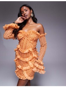 ASOS LUXE gem embellished off shoulder mini dress with scallop hem in orange