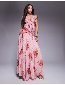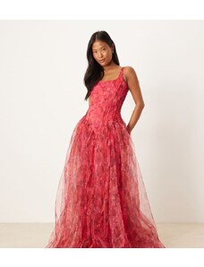Lace & Beads Petite drop waist corset detail maxi dress in red and pink floral