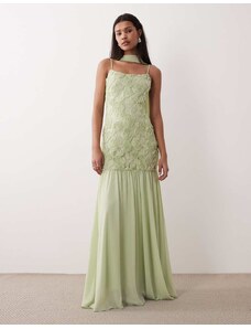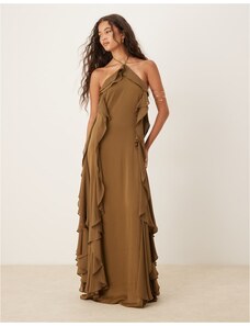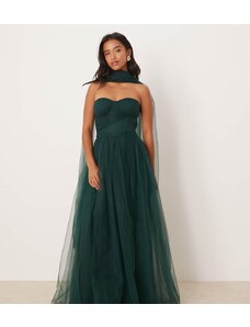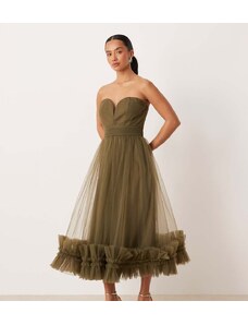 Lace & Beads Petite tulle bandeau midi dress with frill hem in deep olive-Green
