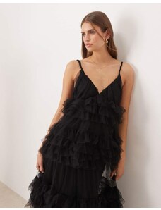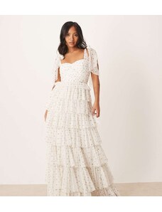 Lace & Beads Petite bow shoulder tiered tulle maxi dress in white polka dot