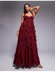 Kaiia exclusive slinky lace asymmetric scarf detail sheer hem maxi dress in dark cherry-Red
