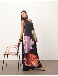 ARRANGE supersize floral embroidered scarf neck one shoulder maxi dress in black