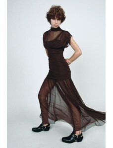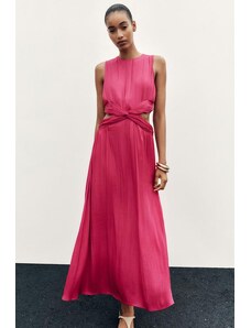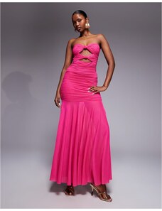 Ruched & Ready sculpted mesh bandeau cut out knot detail sheer hem maxi dress in dragonfruit-Pink