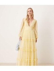 Lace & Beads Petite tulle v neck sheer sleeve maxi dress in lemon-Yellow