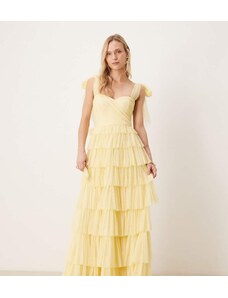 Lace & Beads Petite Bridesmaid bow shoulder tulle maxi dress in lemon-Yellow