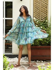 Lace & Beads Petite tulle scarf neck plunge neck tiered mini dress in rose floral