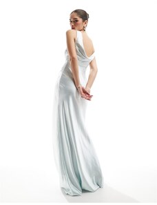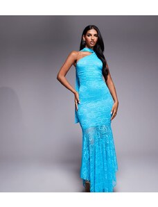 Kaiia exclusive double layered slinky lace asymmetric scarf neck sheer hem maxi dress in aqua-Blue