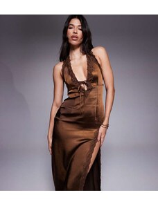 Oh Polly Elyra satin lace trim halter neck fishtail midaxi dress in chocolate brown