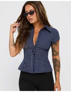Princess Polly Cottesloe cotton rich pleat waist detail fitted short sleeve shirt in navy check