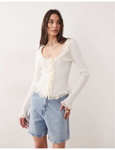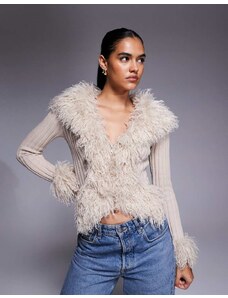 I.AM.GIA Cressida compact knit shaggy faux fur trim zip through cardigan in beige-Neutral