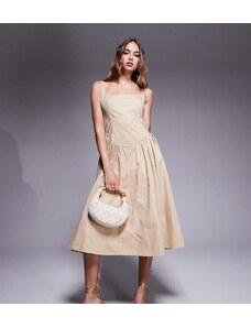 Kaiia exclusive cotton rich square neck gathered hip detail midi dress in beige-Neutral