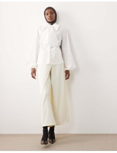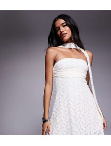 The Frolic exclusive lace ruched bust detail bandeau flippy hem mini dress with scarf detail in cream-White