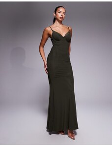 Wanderdoll Leah triple layered sculpting mesh lace cup detail cami fishtail maxi dress in forest green-Grey