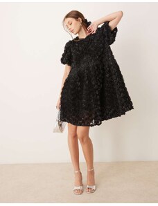 YAS 3D textured rose mini smock dress in black with shimmer gold