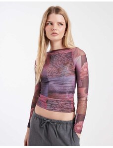 Hugo Red mesh high neck floral t-shirt in yellow and pink with ruched tie side