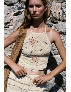 The Frolic exclusive tile crochet tie front beach top co-ord in cream-White