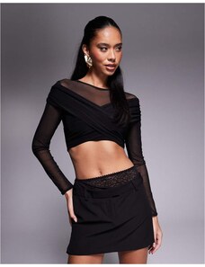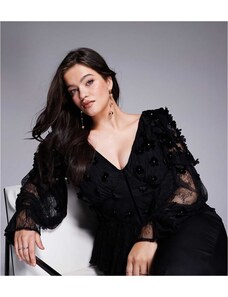 ASOS LUXE Curve mesh floral bardot long sleeved top with velvet flowers and pearl embellishment in black