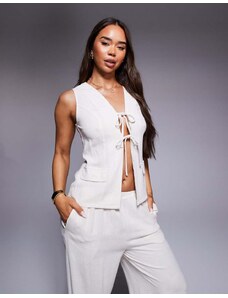 Missyempire linen look pocket detail open tie front top co-ord in cream-White