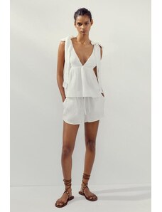 Missyempire linen look pocket detail open tie front top co-ord in cream-White