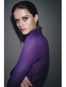 Semi-sheer top in a fine knit fabric. High neck and long sleeves. Contrasting metallic thread appliqué detail.