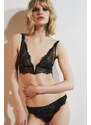 Bra made of soft lace fabric. V-neckline with lined metal application and adjustable thin straps. Back fastening with metal hook.